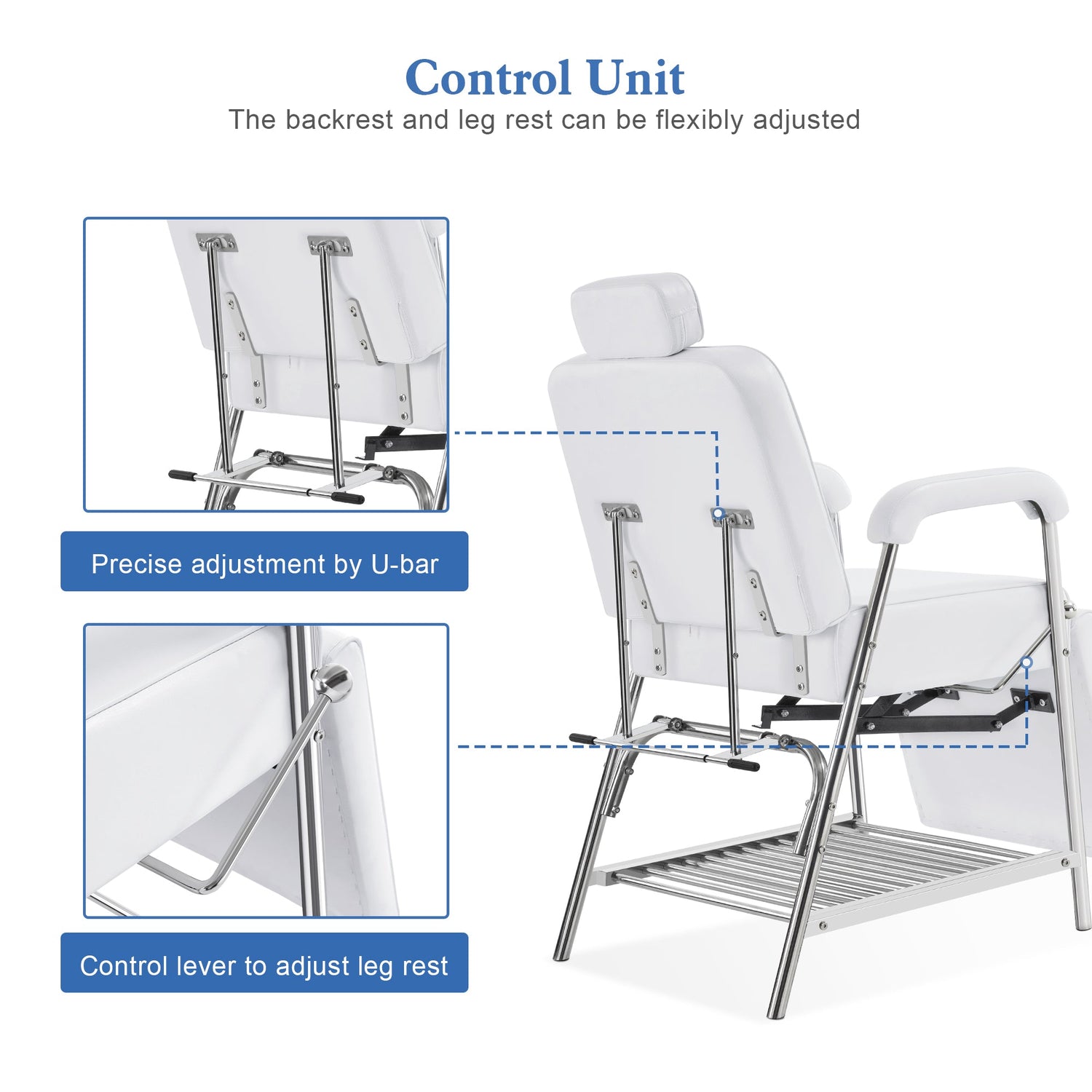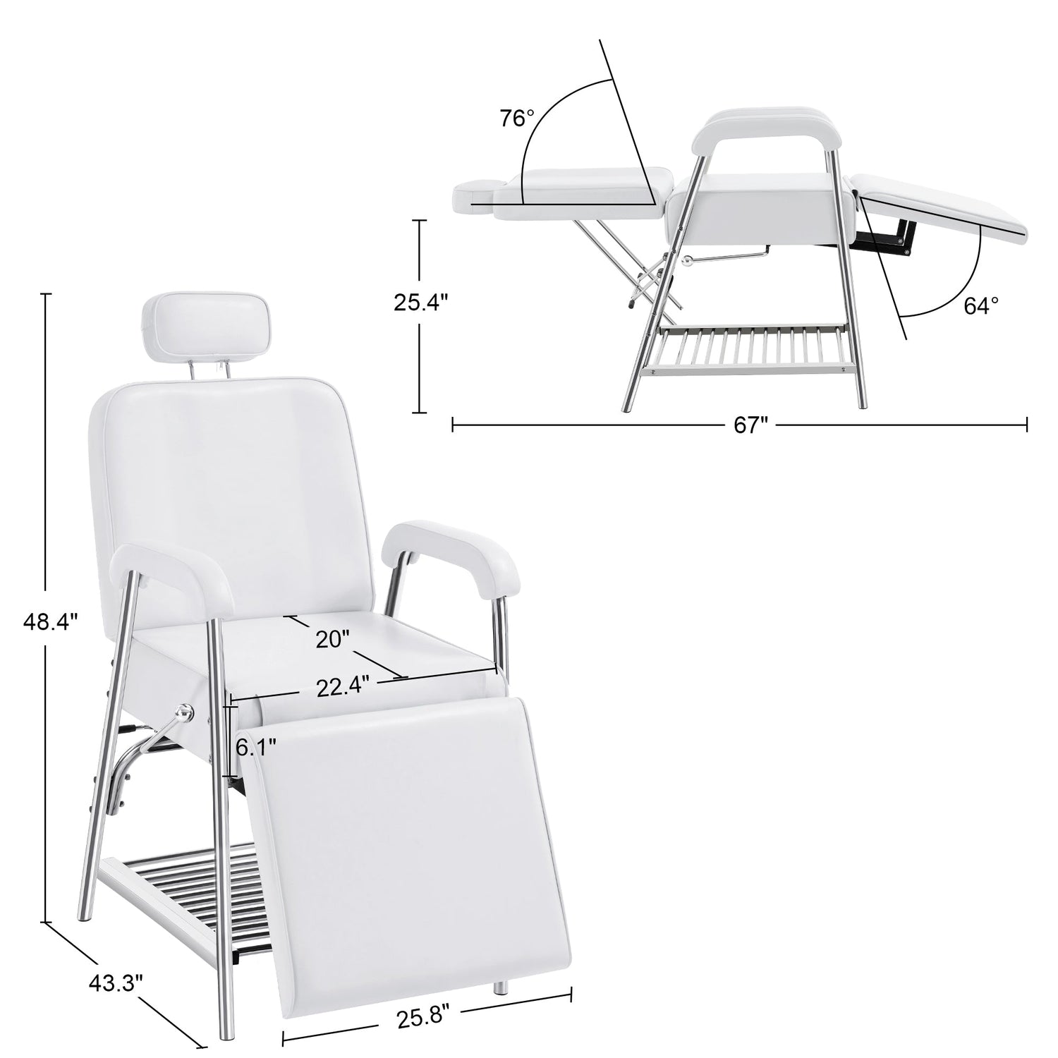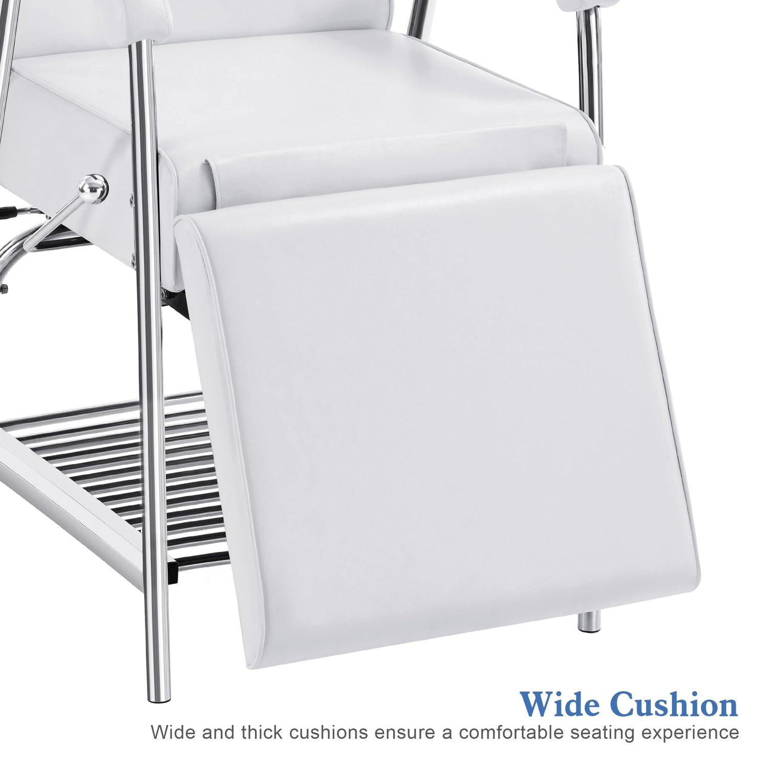 Humanized Design: The bed is wide and reclines to a length of 67'', enabling it to adapt to customers of all sizes. The thickened cushion with high-density sponge provides a comfortable seating position, and the metal shelf on the bottom of the seat offers more storage space for your beauty salon tools.