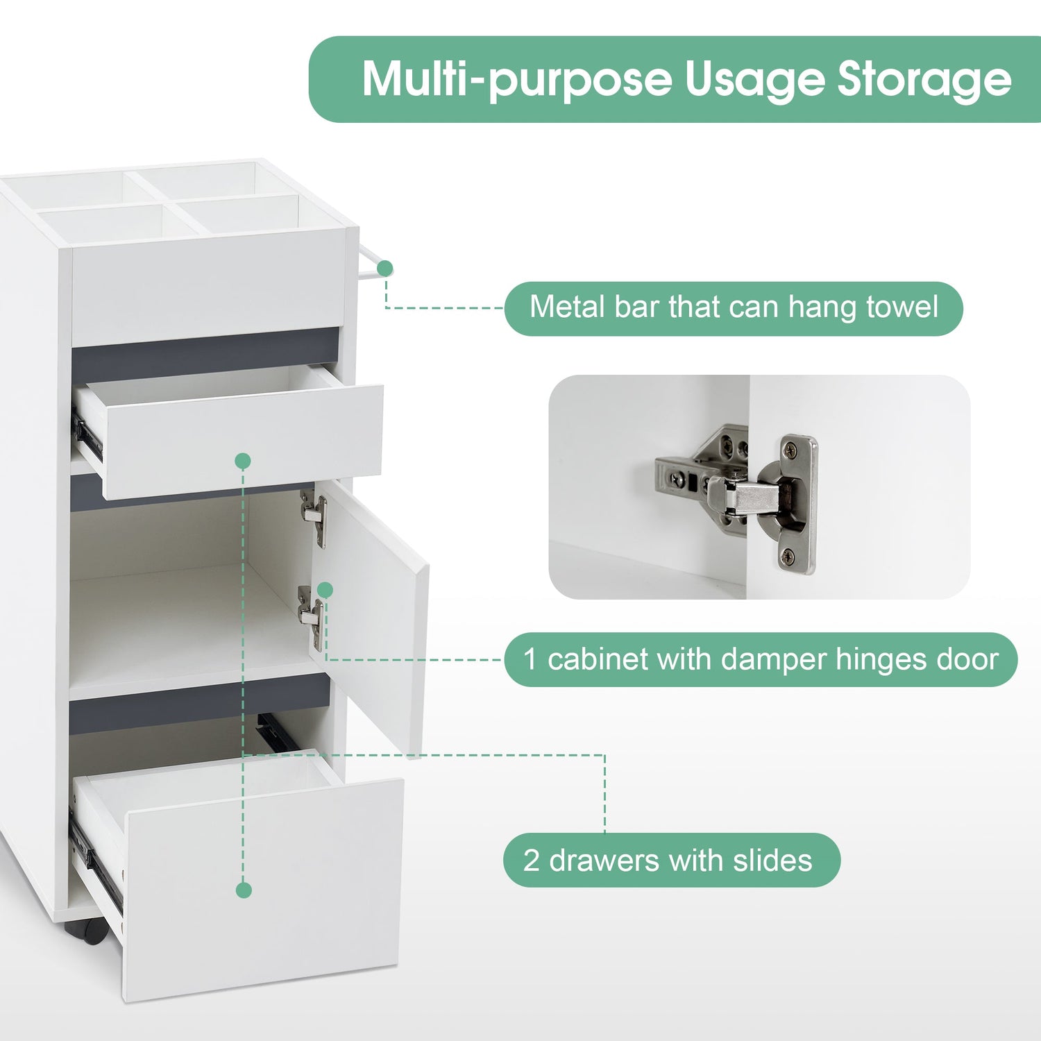 Storage Capacity: the unit comes with ample storage space, such as 2 drawers, 1 cabinet, 4 square tool organizers. There is also equipped with a rod that can hang towels.